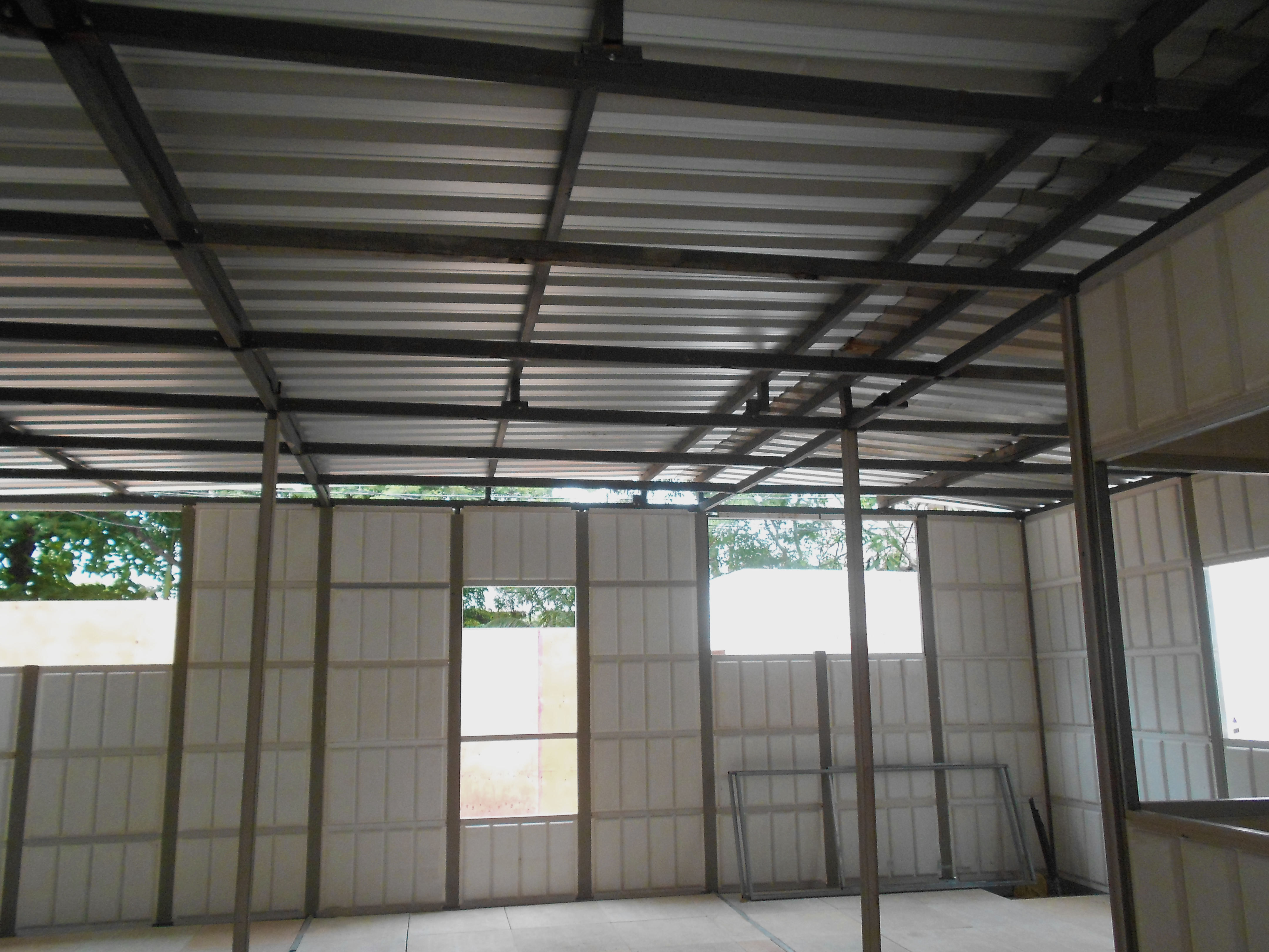 Após a aplicação das telhas de alumínio, é necessário fazer a instalação elétrica e o forro em PVC conforme o acabamento desejado. Janelas e postas são instalados nesta etapa.